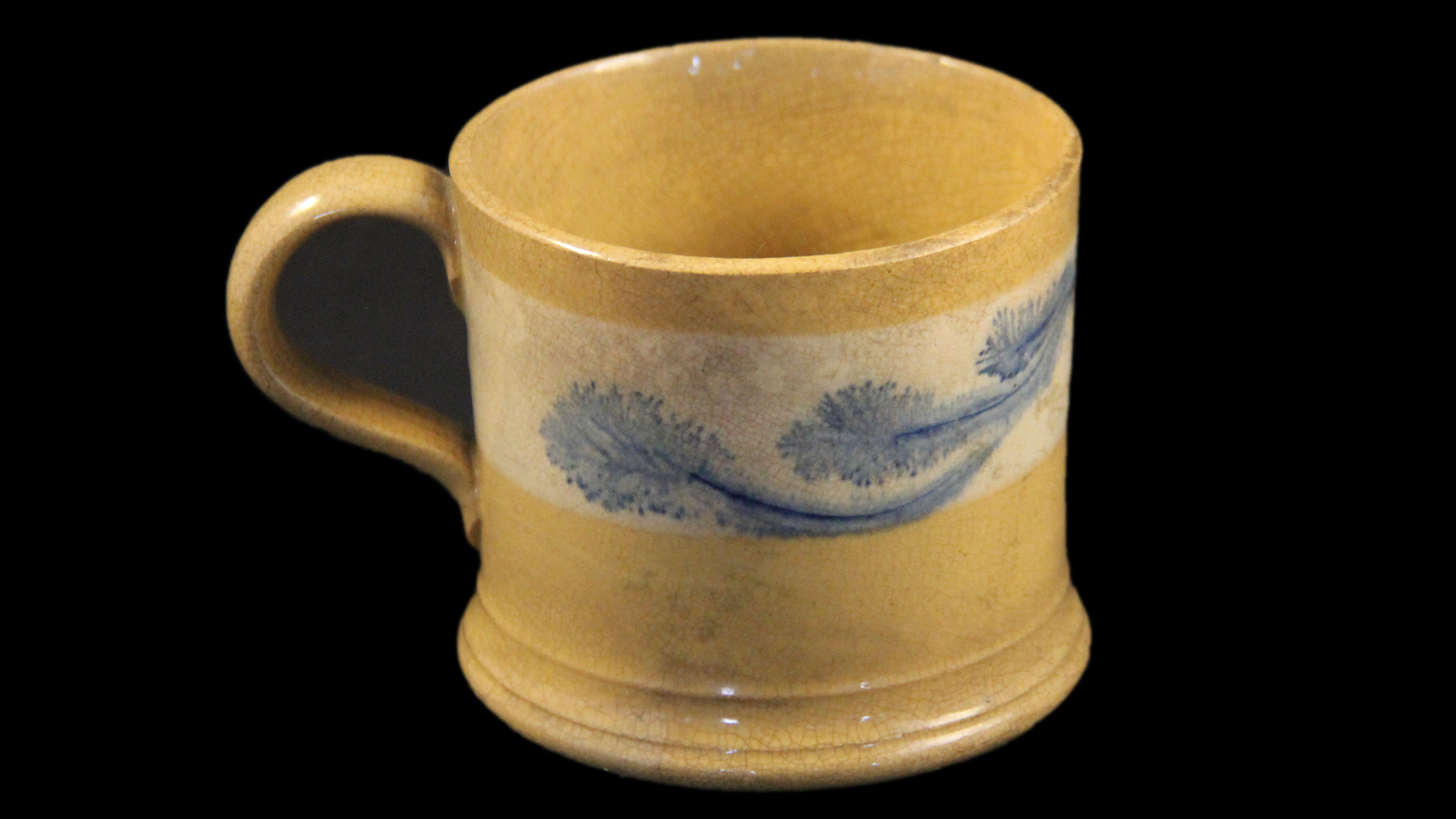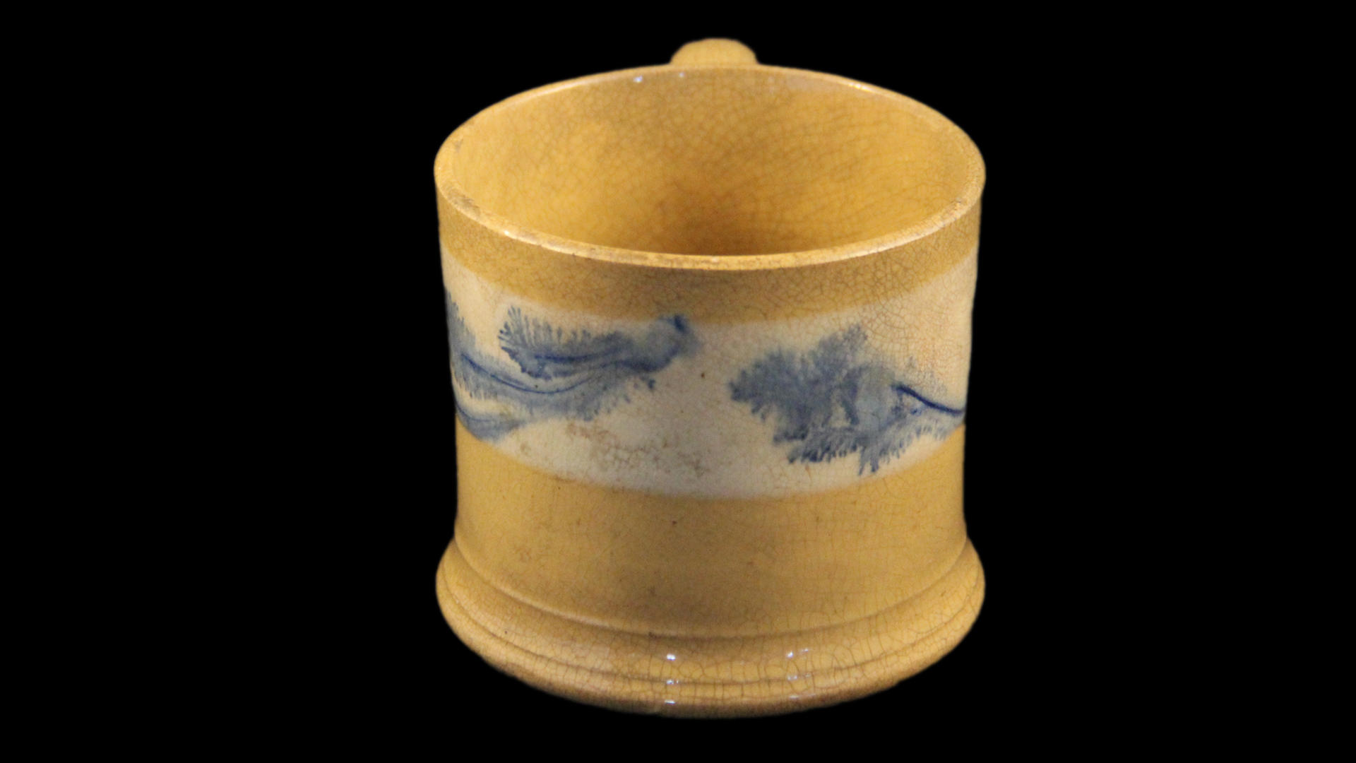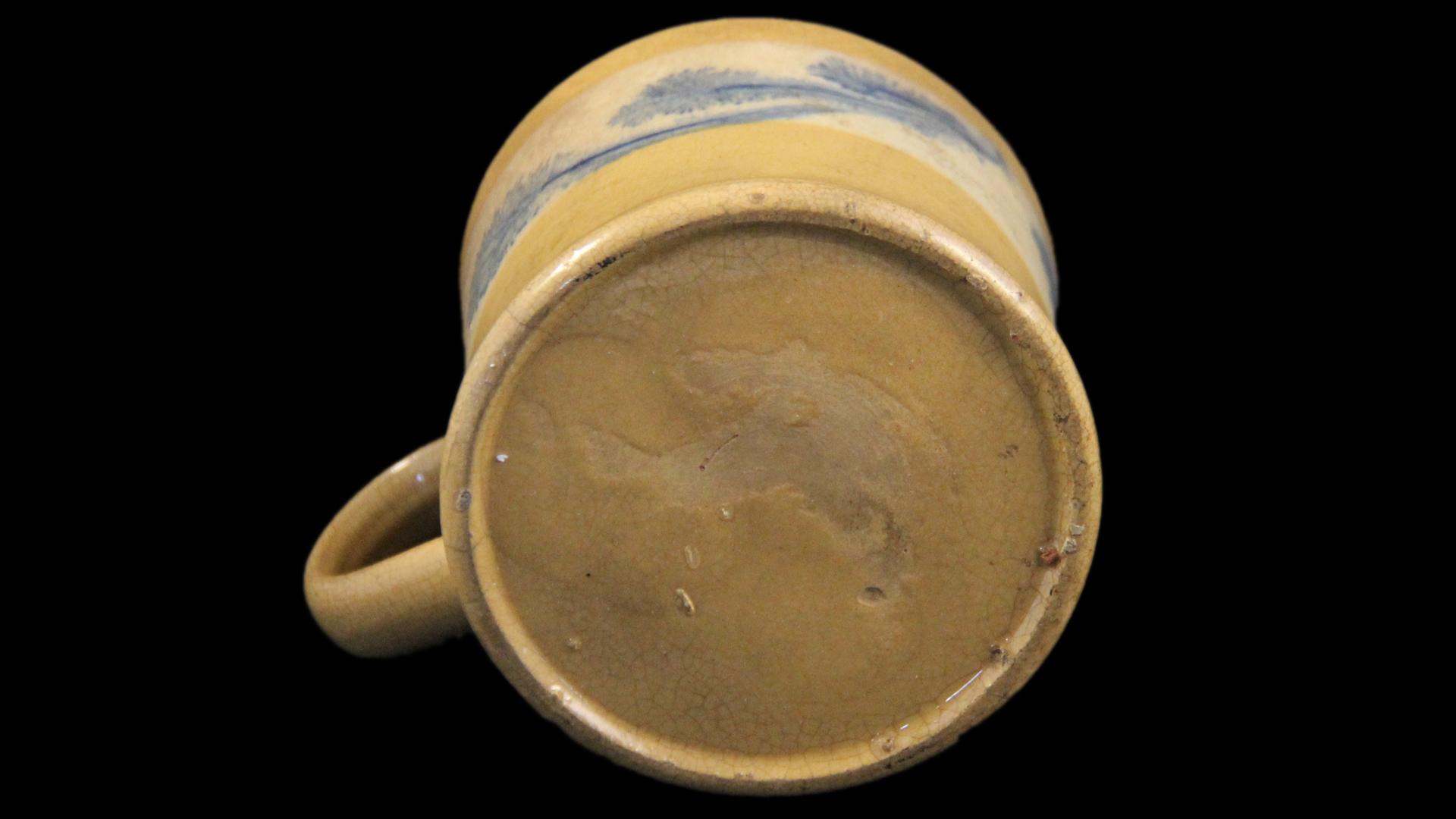 En terre cuite fine jaunette type mocha ware bleu sur bande blanchâtre En parfaite condition, vers 1860-1892