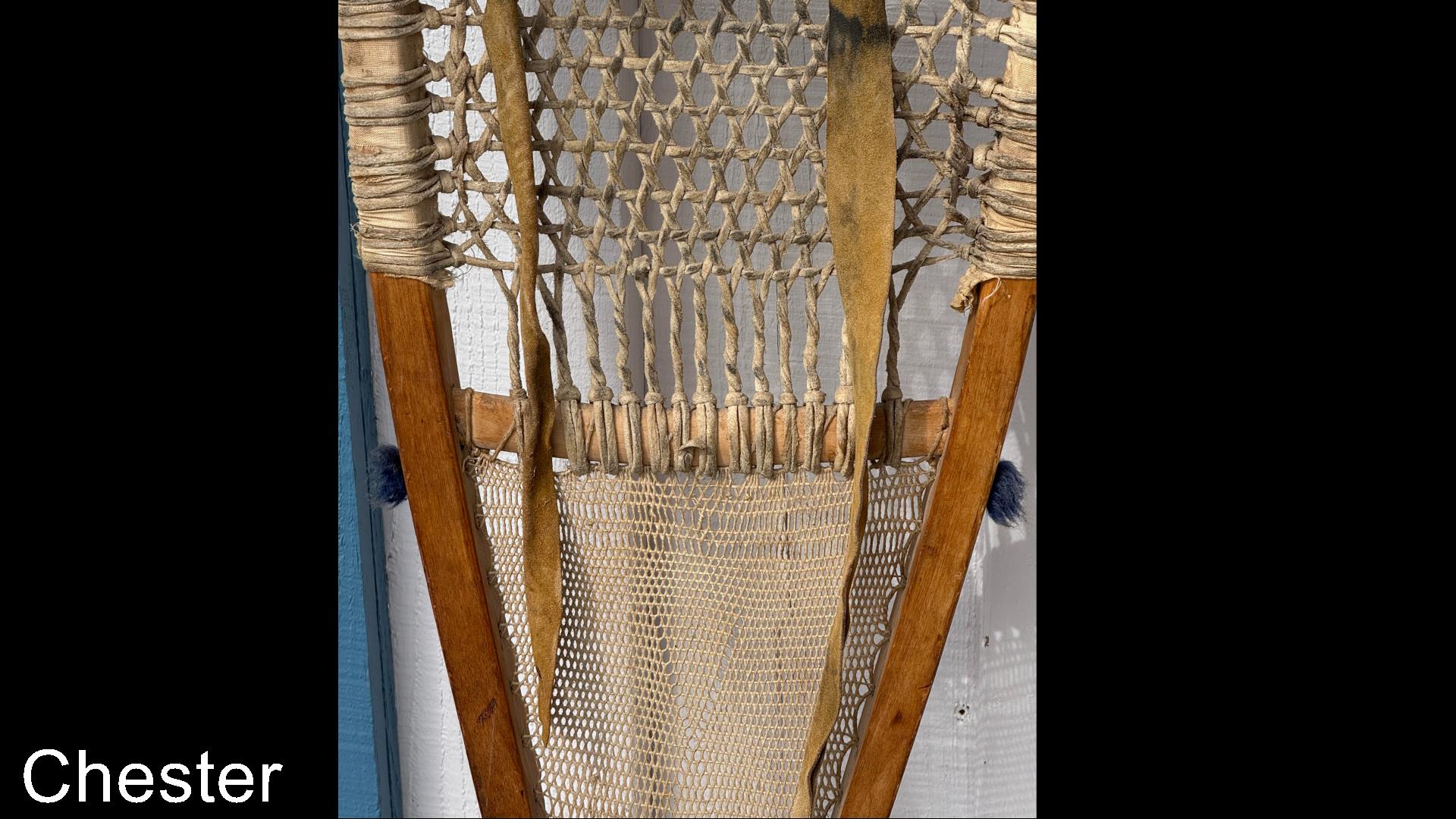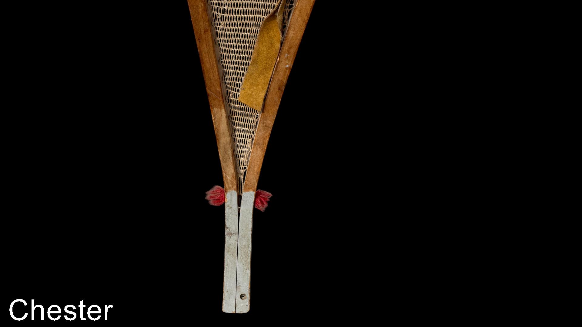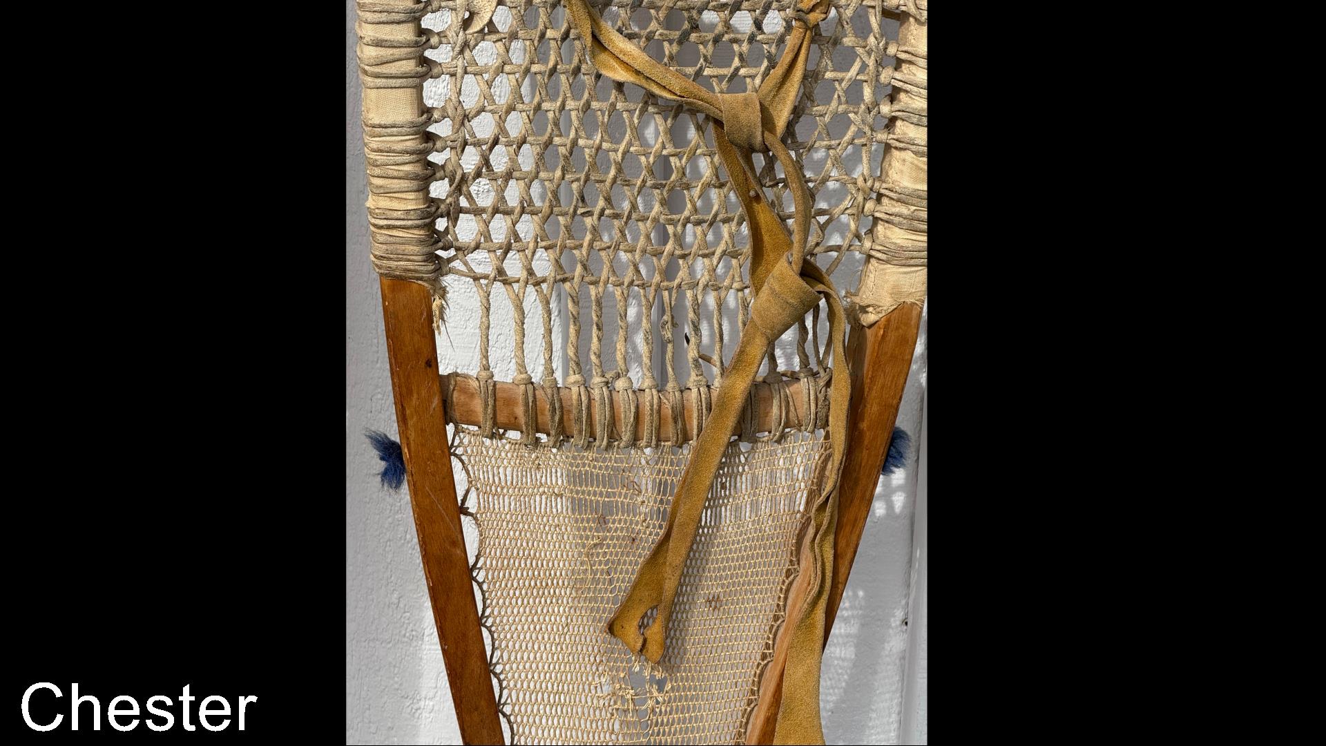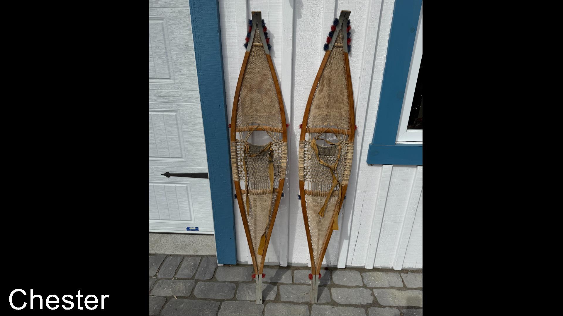 Très belles raquettes de collection datant du milieu du 20? siècle. Le devant et l’arrière des raquettes sont colorés en blanc, agrémentés de pompons rouges apportant une touche vive et traditionnelle. Les attaches sont impeccables et le tressage présente de superbes motifs typiques de l'époque. Ces raquettes, à la fois esthétiques et fonctionnelles, constituent une pièce de choix pour tout collectionneur passionné d’objets anciens et d’art populaire.