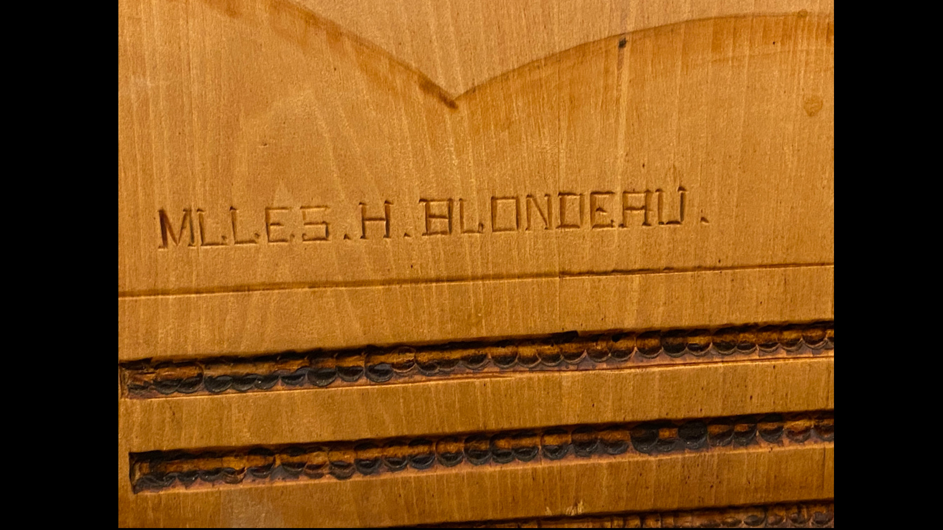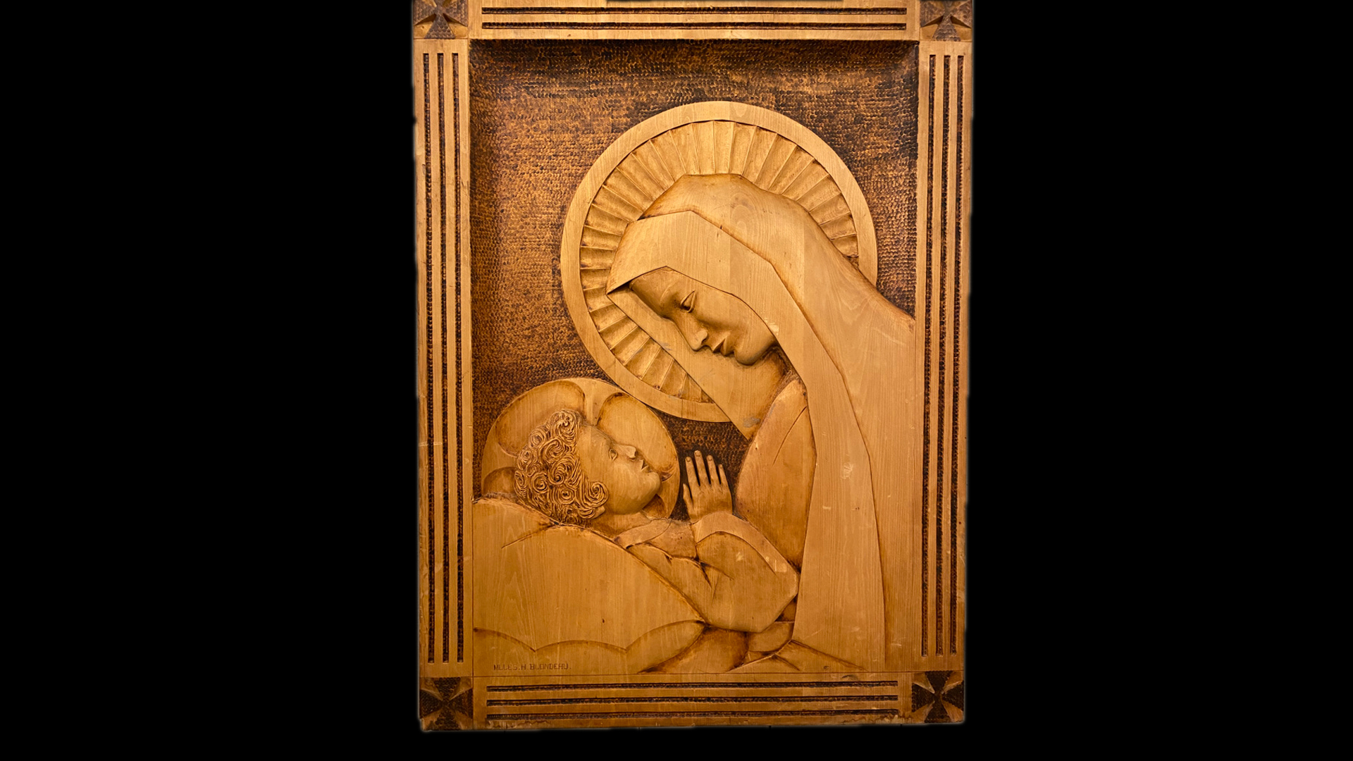 C’est fait par les demoiselles Blondeau de Québec. Elles ont fait de l’art populaire à Québec entre 1920 et 40. Immense par relief en bois d’une vierge à l’enfant. Signé et localisé à Qc. C’est la plus grande piece connue de cette famille. Ils font des tout petits bas reliefs peint ou pas. Vieil art populaire.